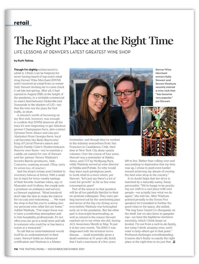 In 2016 She and Steven moved to New York City. In her four years NYC, she was a sommelier at Babbo and Cut by Wolfgang Puck, and in 2018 she passed the Advanced Sommelier exam. In 2019 she was diagnosed with ALS, a progressive and terminal nerve disease. There was no better time than ever to pursue her dream of owning a wine shop. In July 2020, Sally and Steven moved to Denver to conquer their dream of owning the best wine shop the Front Range has ever seen.