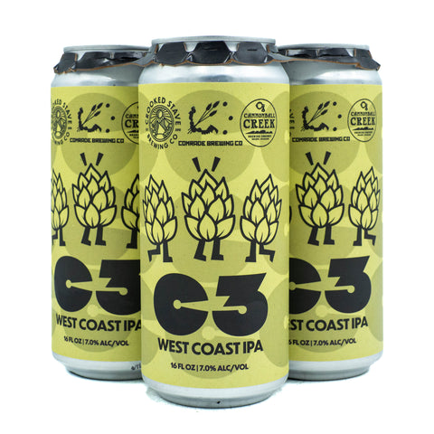 Crooked Stave Brewing Co.'s C3 is a West Coast IPA, in collaboration with Comrade and Cannonball Creek Breweries. This brew is packed with Citra, Chinook, and cryo hops!