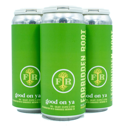 Forbidden Root Brewery - Columbus, in collaboration with DankHouse Brewing Company, presents Good On Ya, an XPA. Boasting Galaxy, Citra, and Eclipse hops, this brew is for anyone.